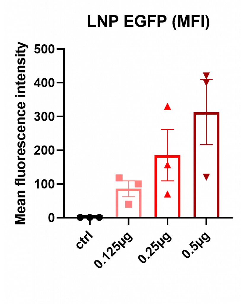 In a second step, Mean Fluorescence Intensity (MFI), used as a proxy for intracellular mRNA levels, increased proportionally with RNA dose, consistent with expected dose-response behavior.
